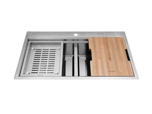 - Phụ kiện cao cấp đi kèm: Sản phẩm đi kèm rổ phụ inox và thớt gỗ chắc chắn, hỗ trợ rửa rau củ, úp chén đĩa hoặc sơ chế thực phẩm ngay trên chậu.