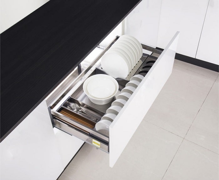 – Hệ thống ray trượt giảm chấn giúp đóng mở nhẹ nhàng, không gây tiếng ồn